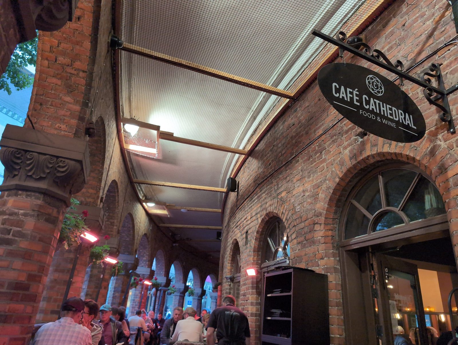 Restaurant in old Cathedral in Oslo center. Sit outside and enjoy the arctecture and bustle of the city. GF pizza, bread, and many options.